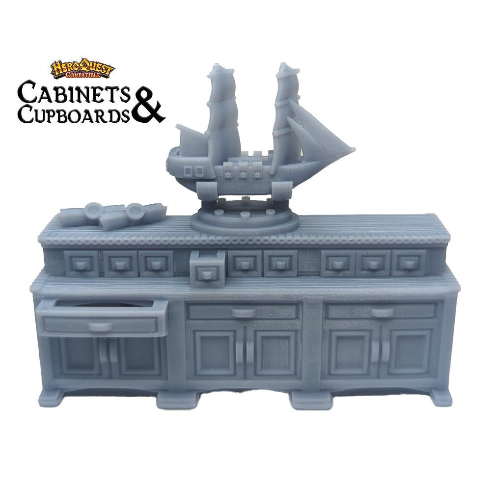The cabinet measures approx. 66mm x 46mm on the base and 46mm tall and is designed to occupy three spaces/square on the HeroQuest board (3x1).