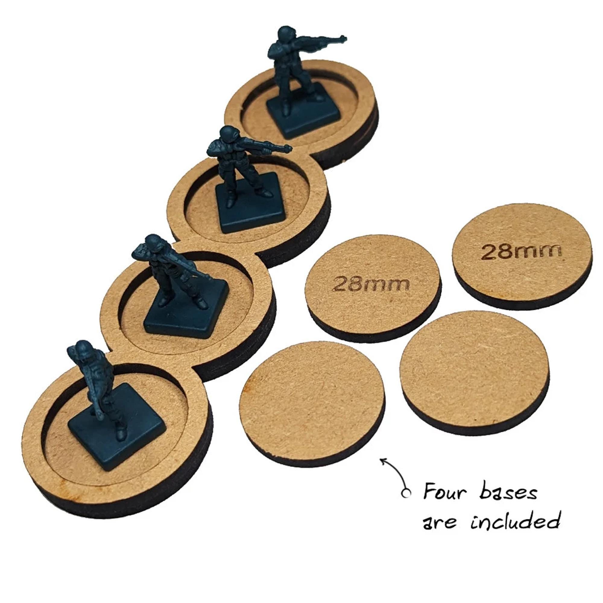 This FOUR Unit MDF movement tray is designed to hold FOUR 28mm round bases and are ideal for miniatures, war or board gaming. ONE movement tray incudes FOUR 25mm pill bases - use these to base your units, or simply place your units directly on the movement tray.