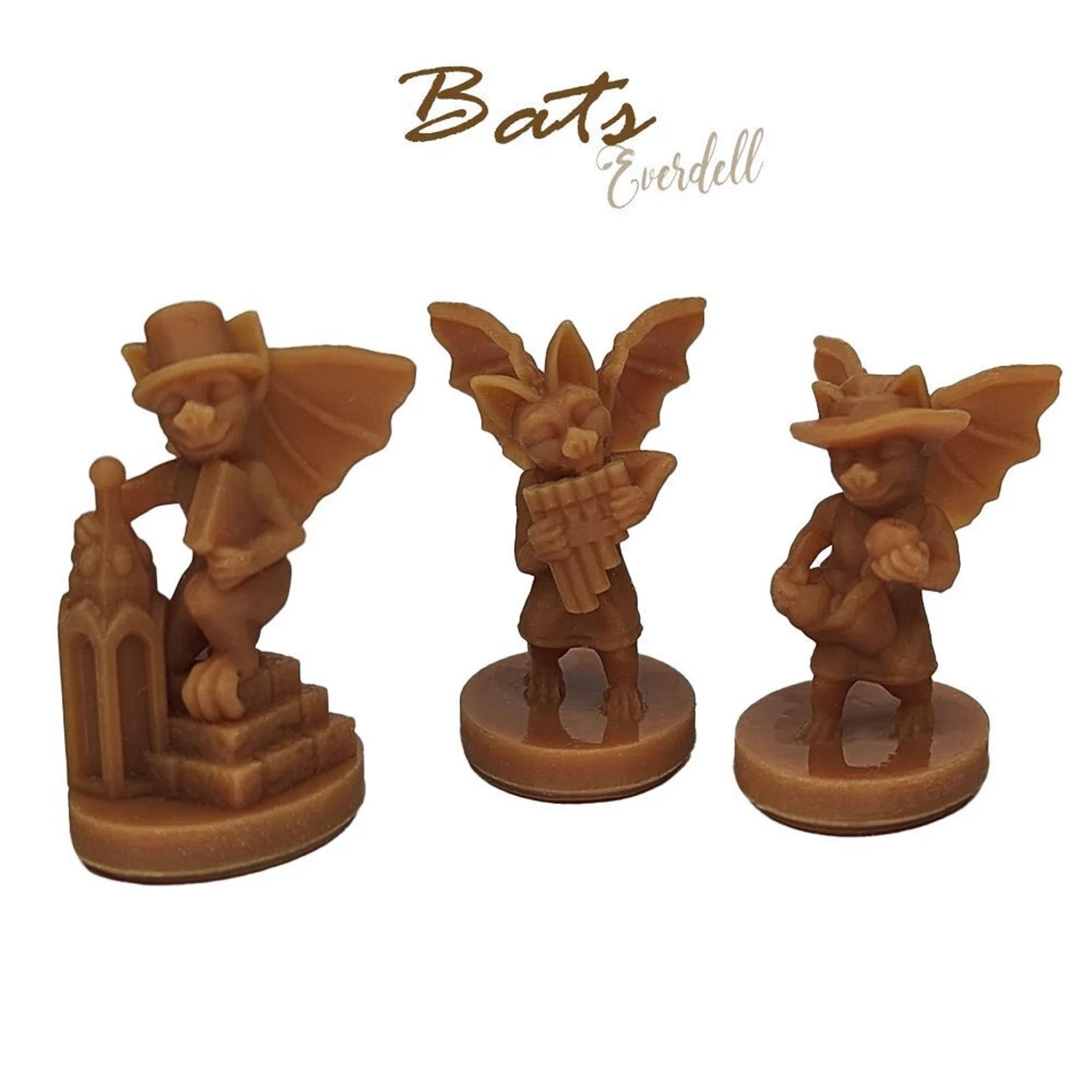These Bats designed for the Everdell Newleaf expansion are everything you need to enhance the game and includes 6 unique models available in GREY (ideal for painting) or BROWN, which matches the color of the original game pieces - CHOOSE in OPTIONS which you would prefer!