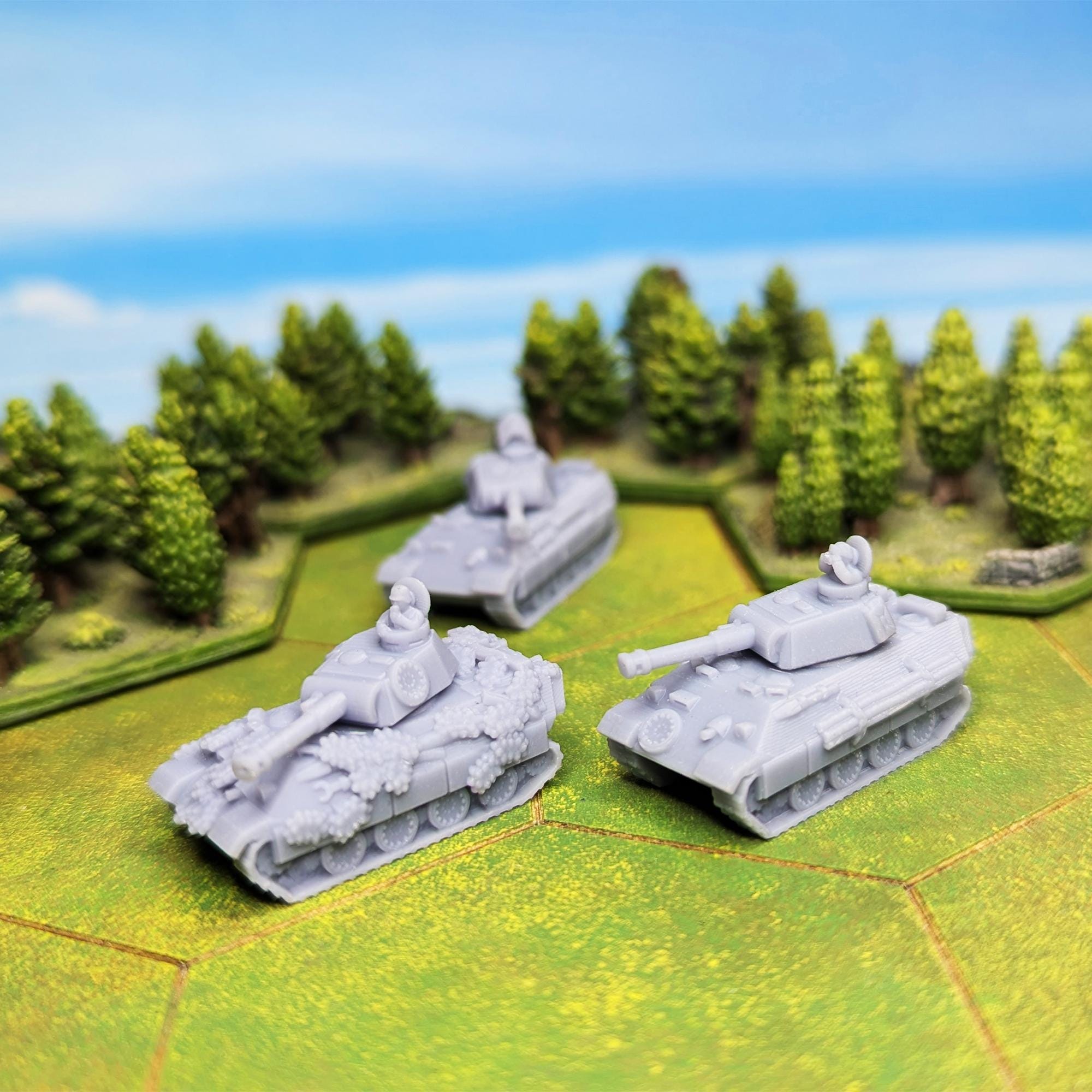 These German Panthers, or Panzerkampfwagen (Pz.Kpfw.) Tanks of World War 2 represent one of the most lethal main battle tanks of the war. Featuring FIVE unique hull designs with removable and rotatable turrets, these models will look great in Memoir 44, Axis & Allies, Command & Colors or any other battle, campaign or map of the era.