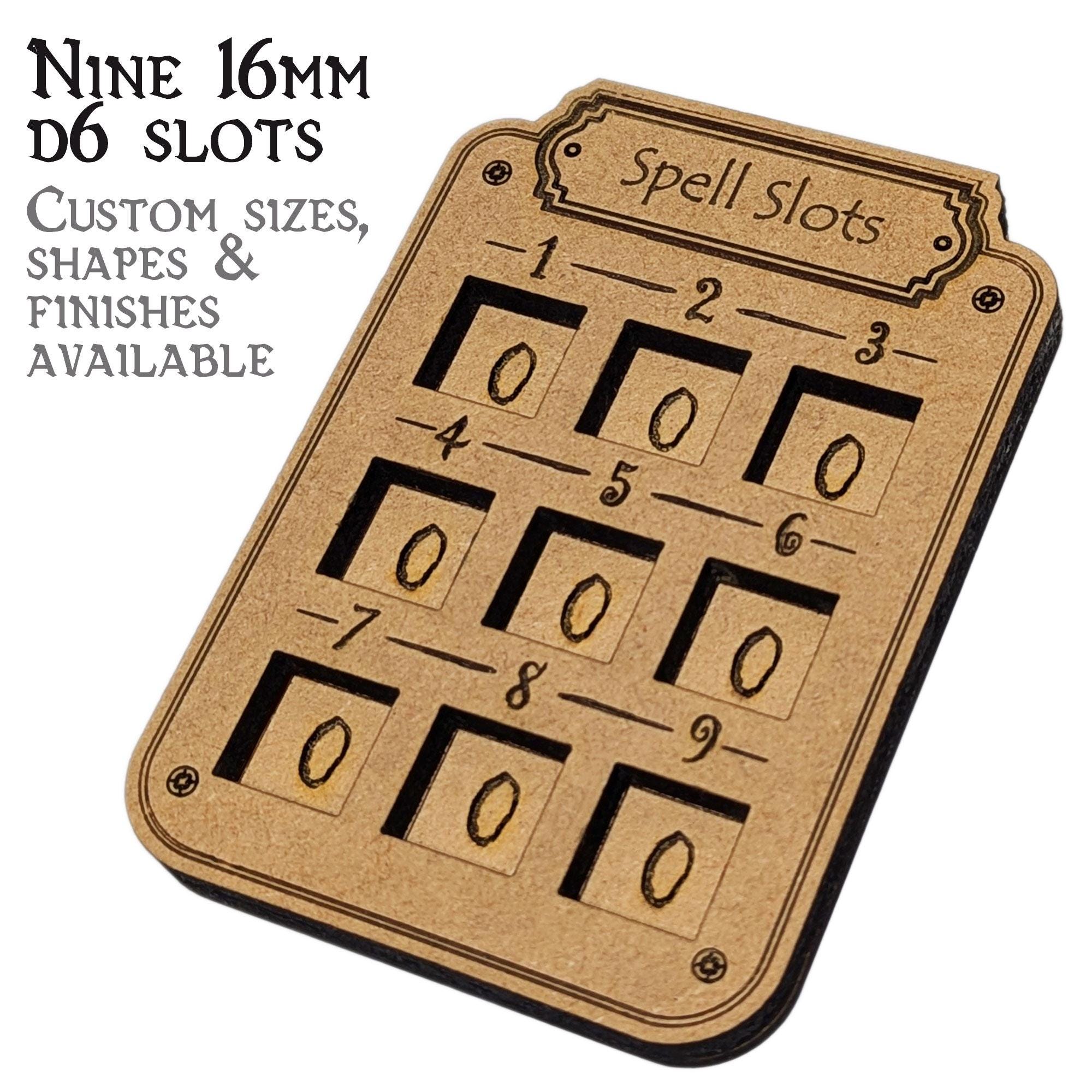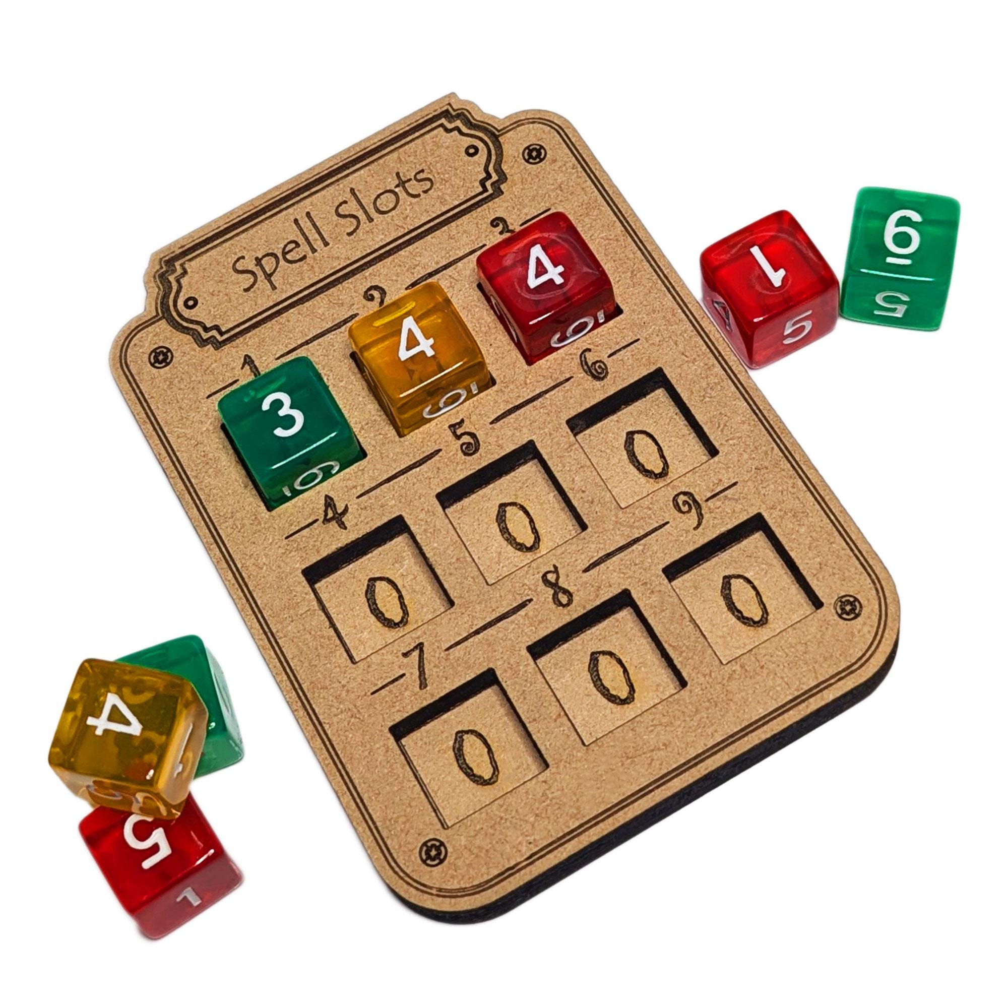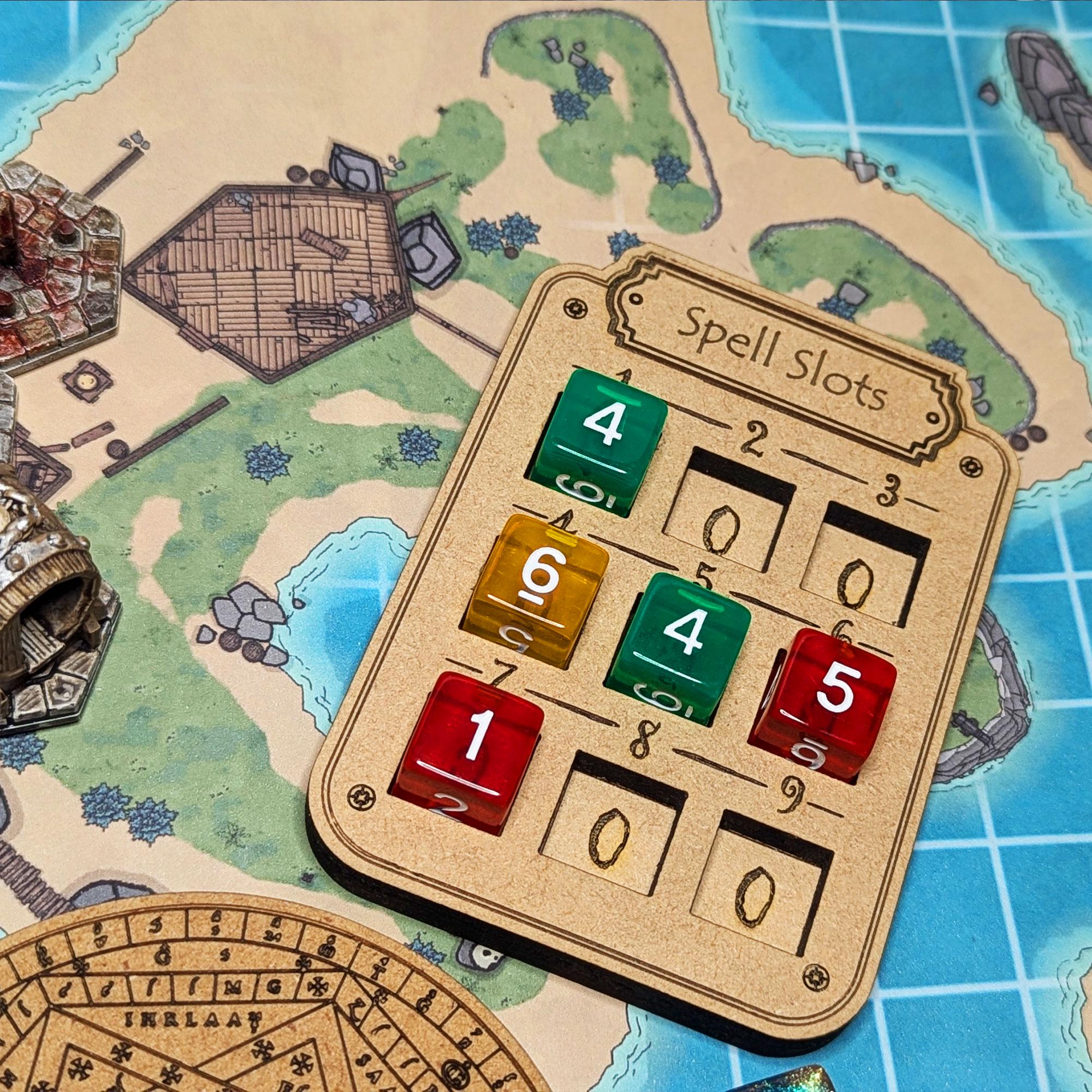 This spell slot tracker is a quick and easy way to see and track how many spells you have at 9 different levels, using standard 16mm d6 dice (not included), and is ideal for TTRPG and RPG games, maps and campaigns such as Dungeons & Dragons, Mork Borg and more!