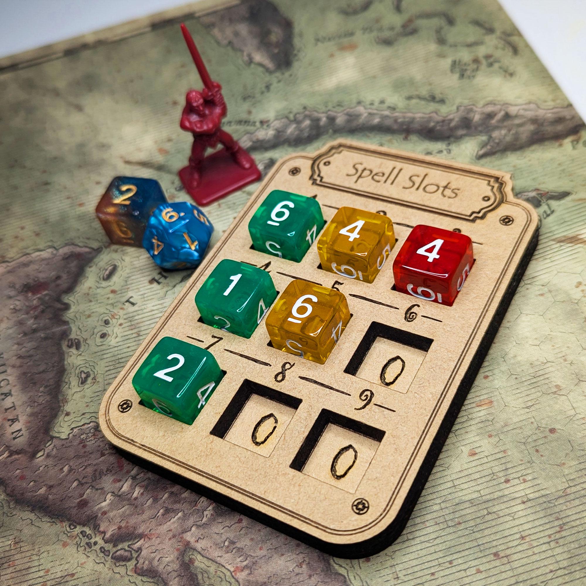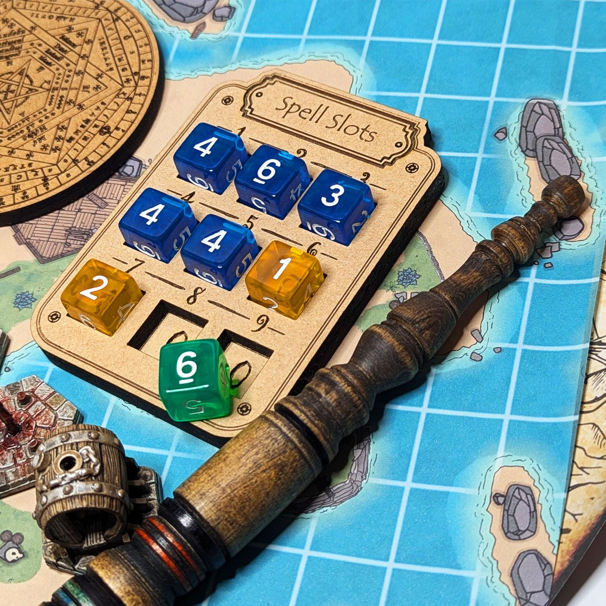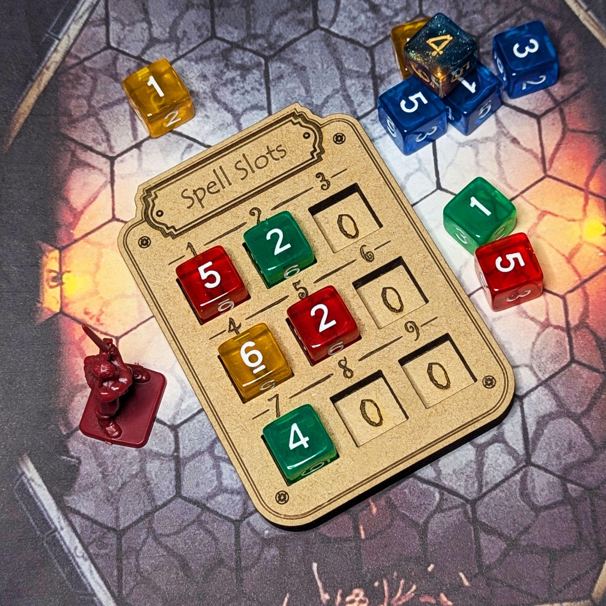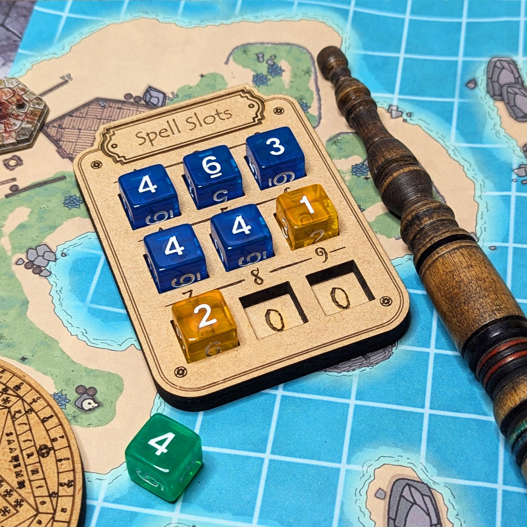This spell slot tracker is a quick and easy way to see and track how many spells you have at 9 different levels, using standard 16mm d6 dice (not included), and is ideal for TTRPG and RPG games, maps and campaigns such as Dungeons & Dragons, Mork Borg and more!