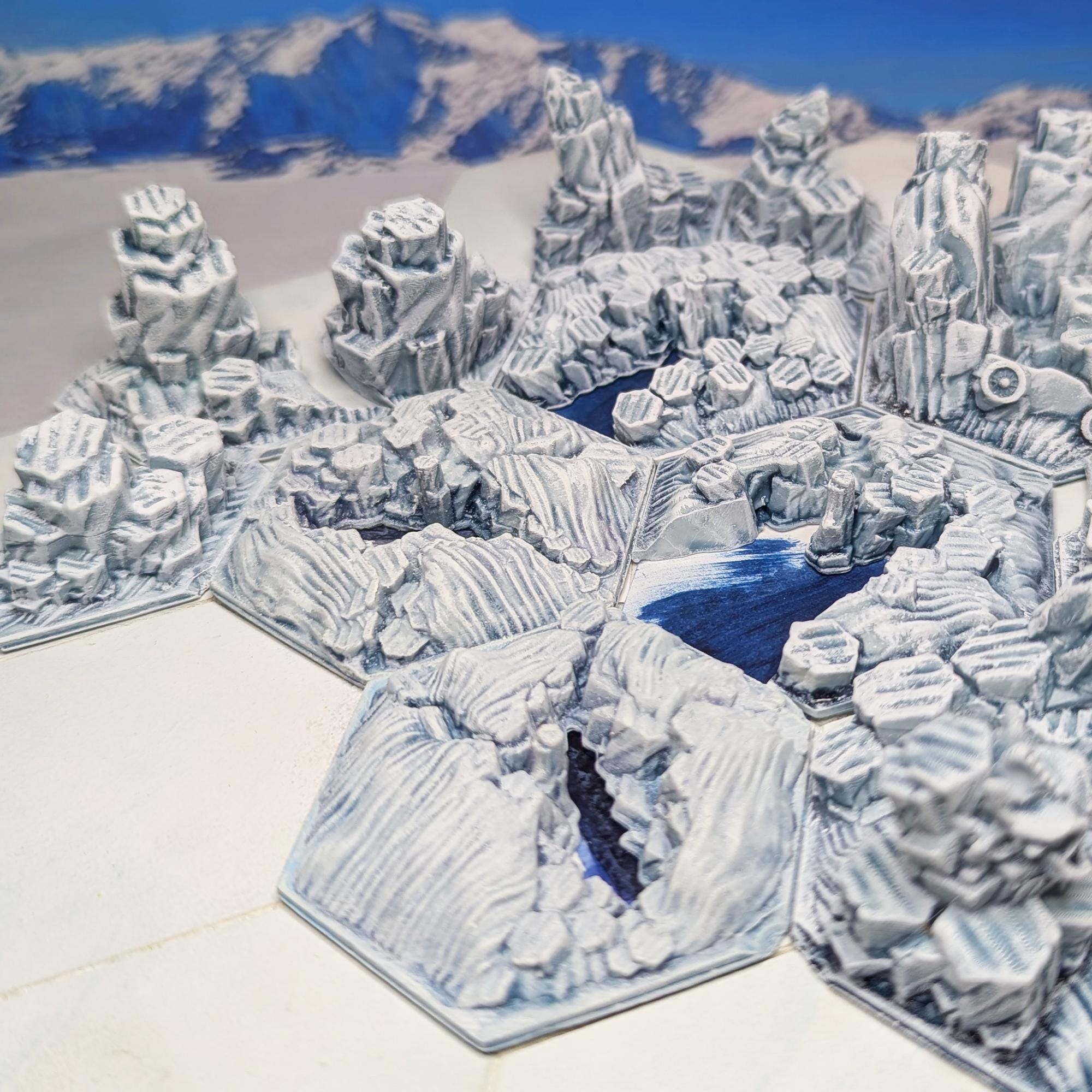 These four unique models represent the impassable crevasses and canyons of desolate icy landscapes, planets and battle maps. Hidden between the fallen nooks and crannies are the bones of ancient animals, fallen space craft and the remnants of lost civilizations. Designed to work with 60mm hex battle maps used by such games as Star Wars: Battle for Hoth or Memoir'44, these pieces would look great in any compatible campaign or TTRPG such as Mork Borg and Dungeons & Dragons.
