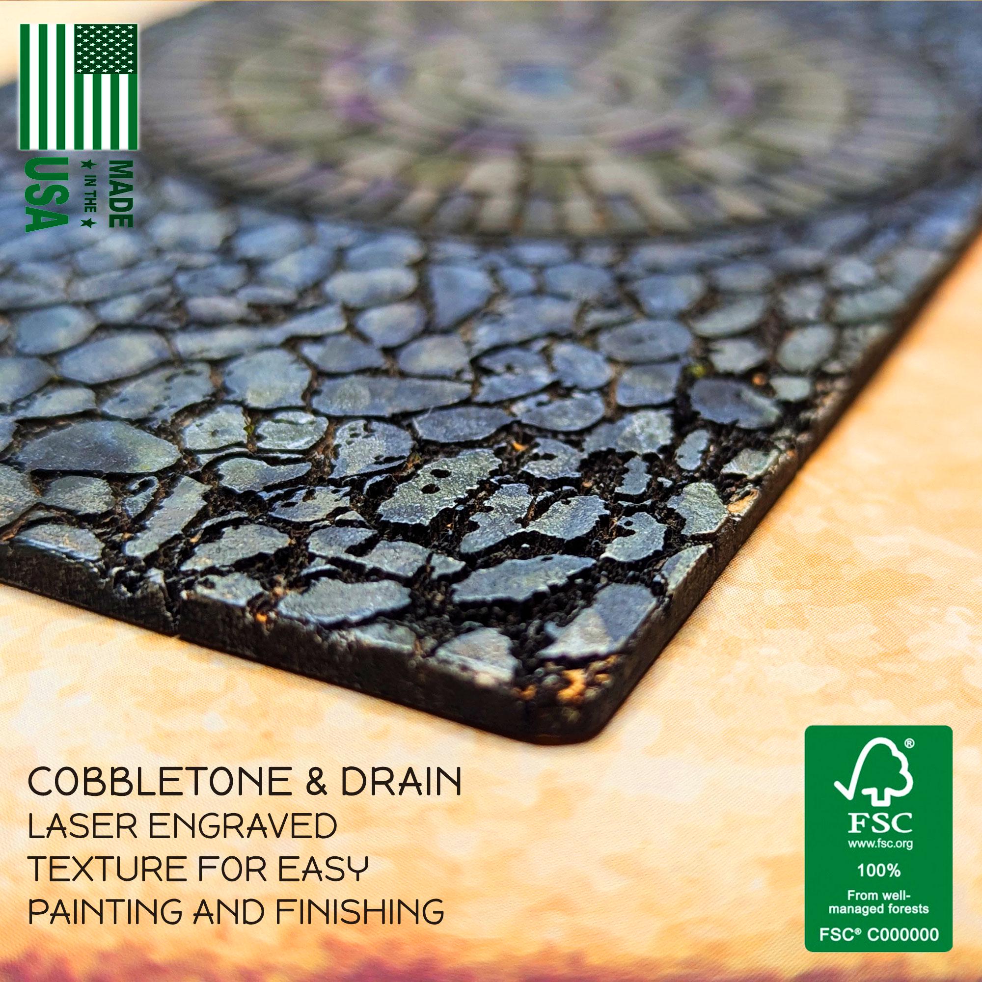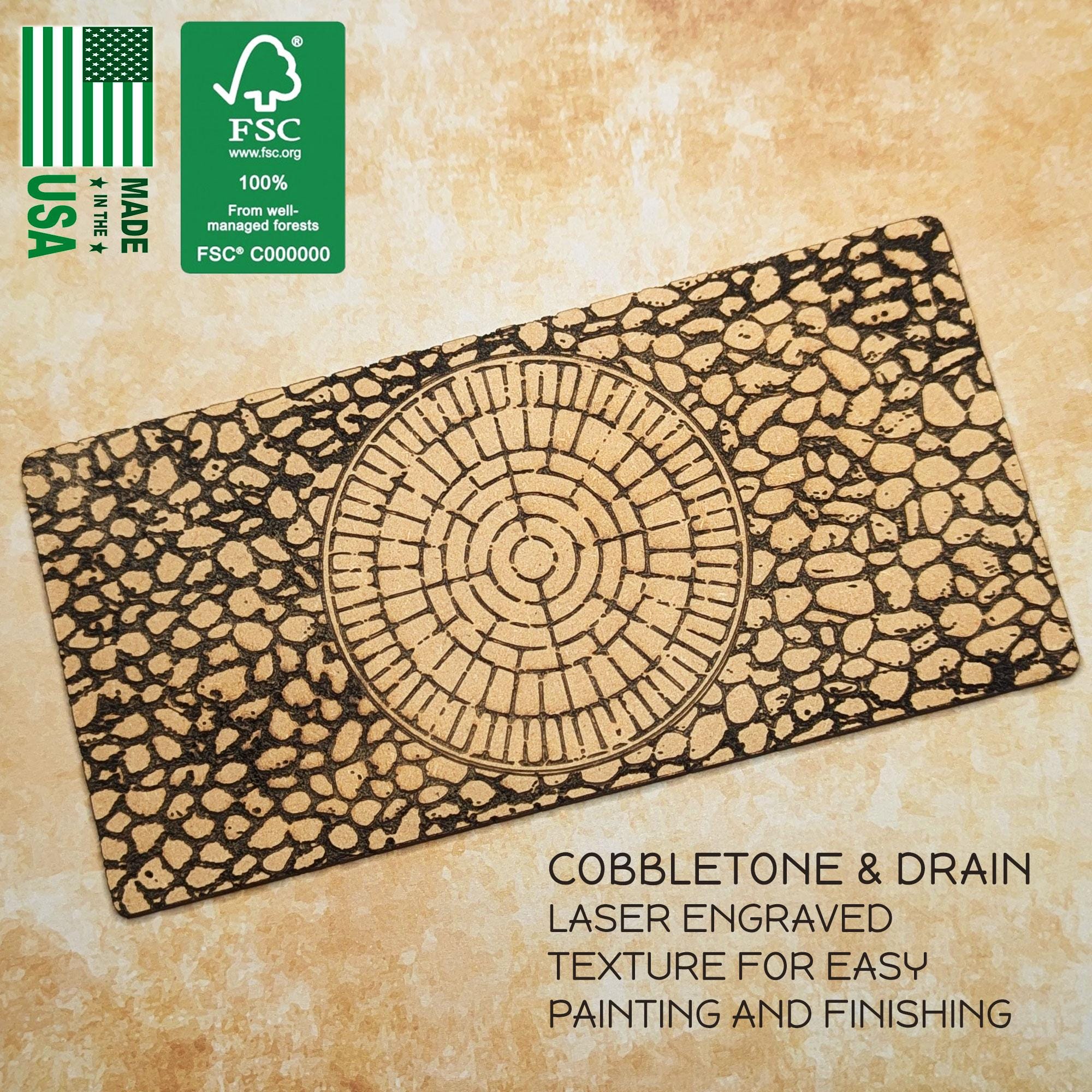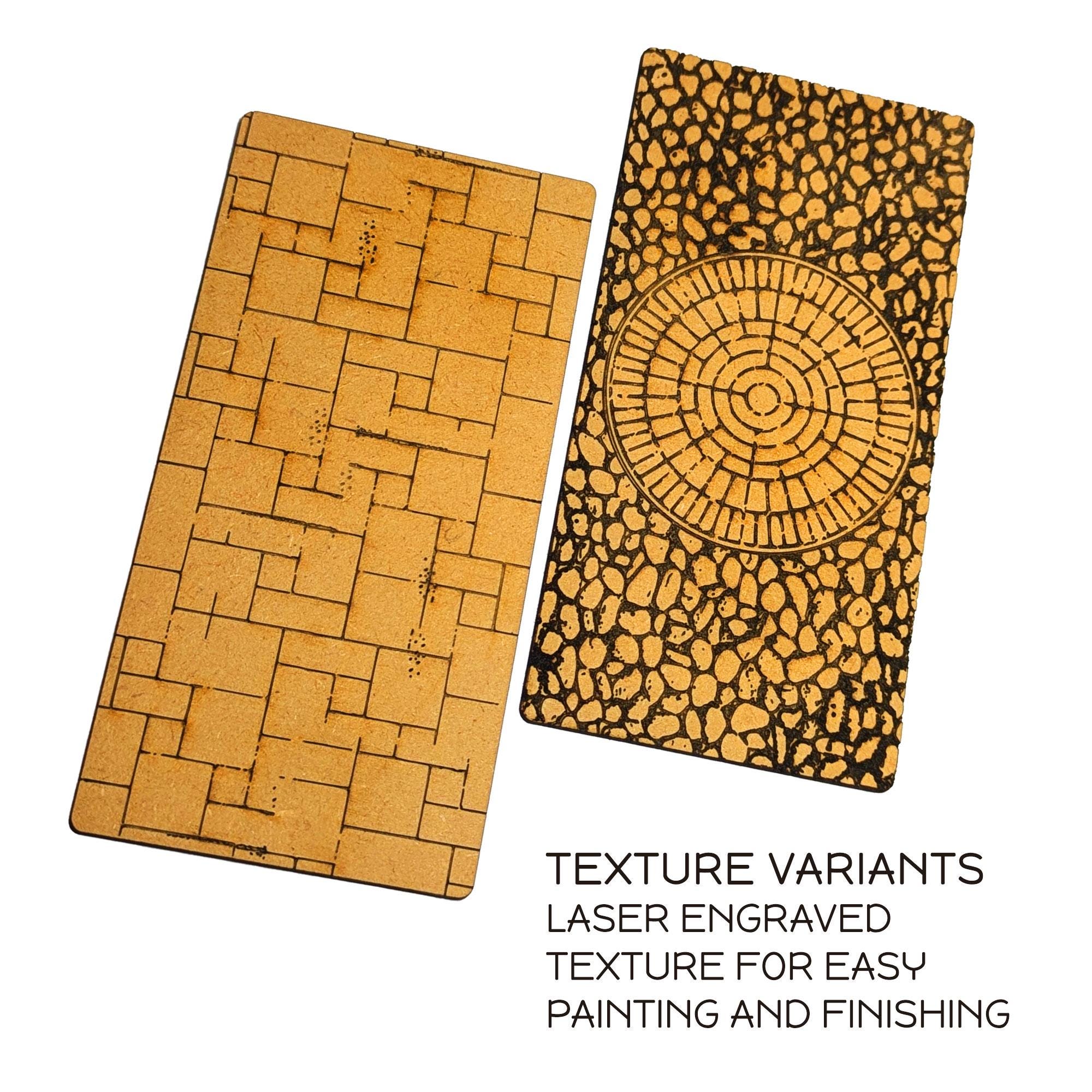 These 3mm and 6mm MDF bases are 6" (152mm) long by 3" (76mm) wide, matching the dimensions of Warhammer 40k ‘Small Ruins’, but are ideal for generic gaming terrain, Dungeons and Dragons, crafting and more - and feature a laser engraved cobblestone texture that creates an instant impact on the battle map, and is easy to prime, paint and finish to create even more realistic effects and visuals.