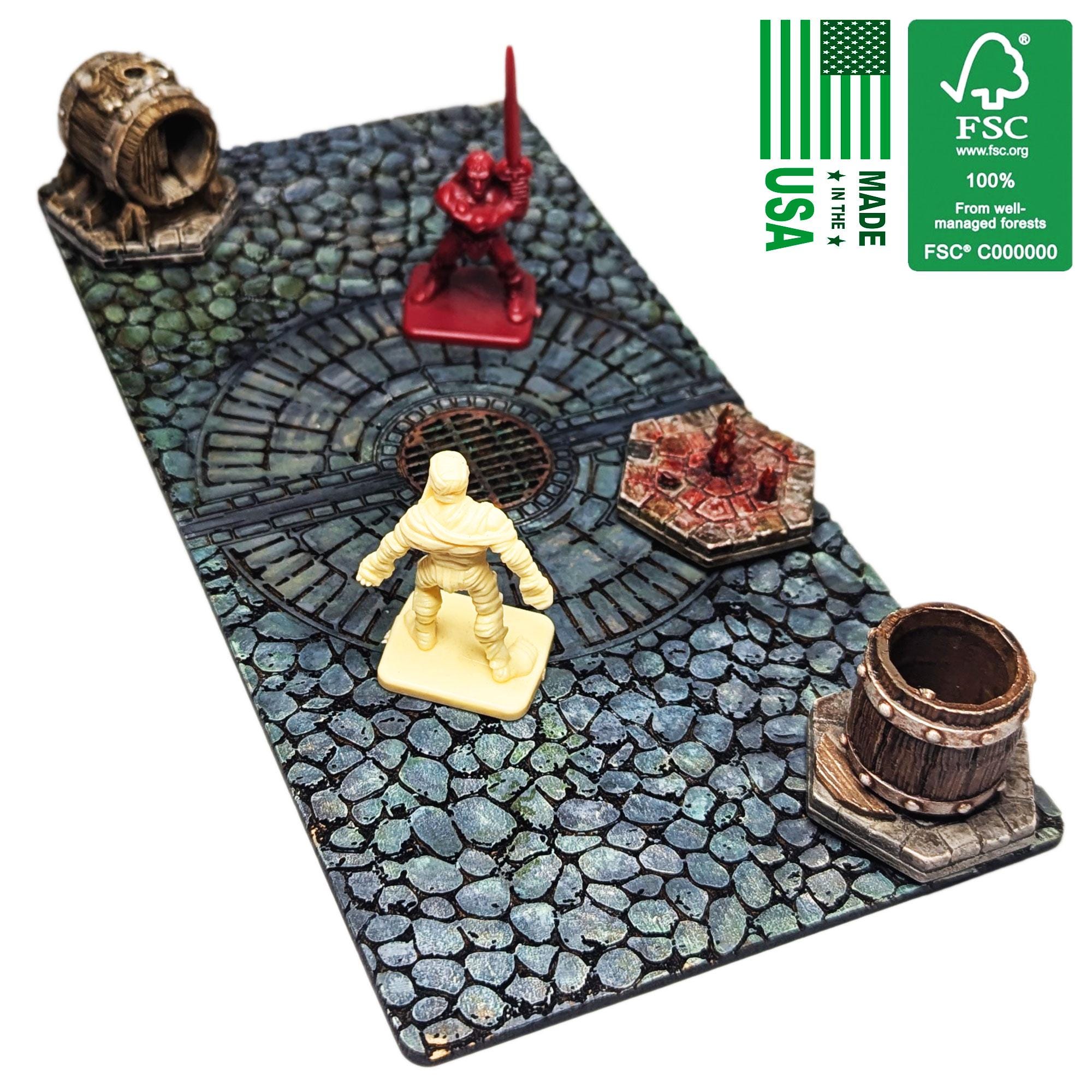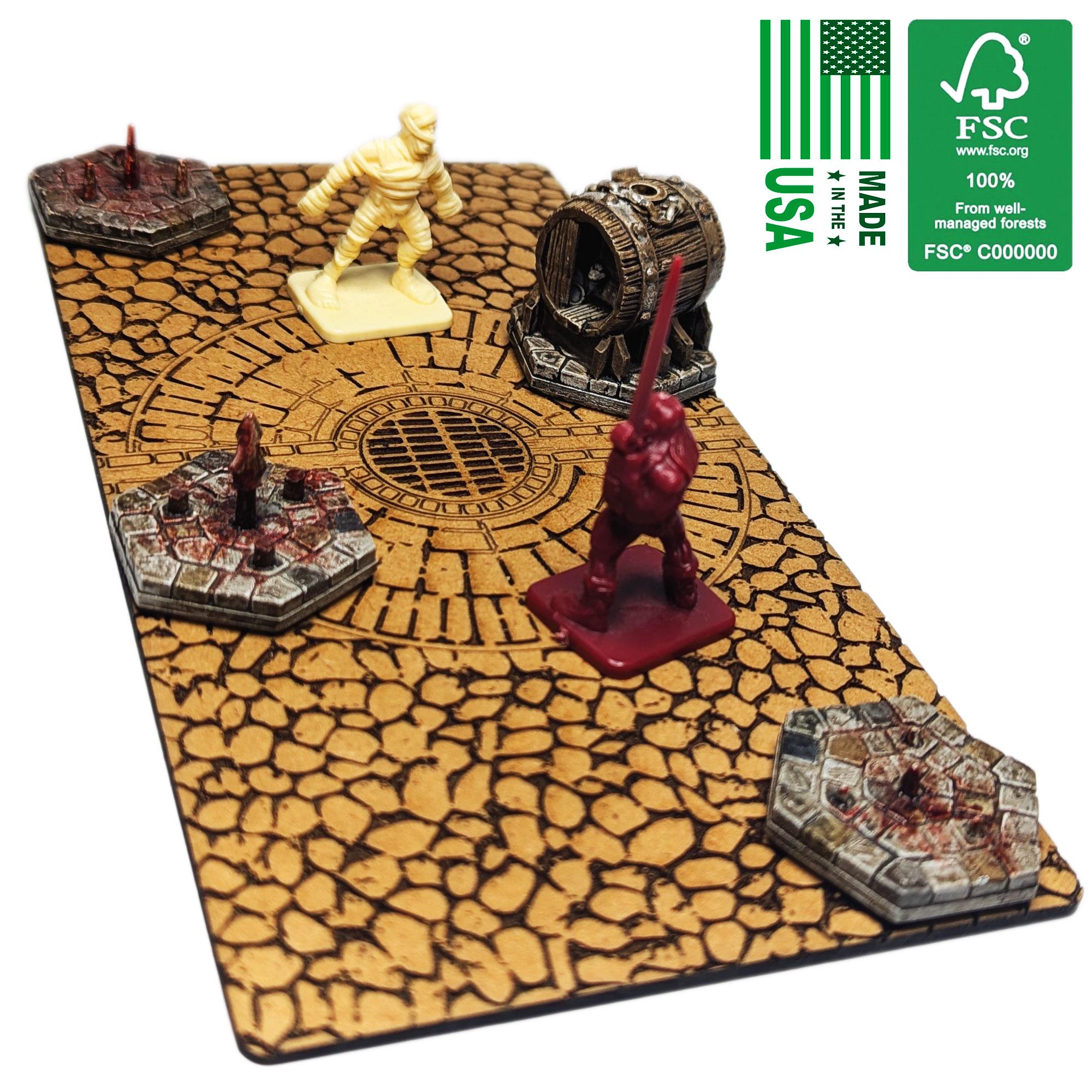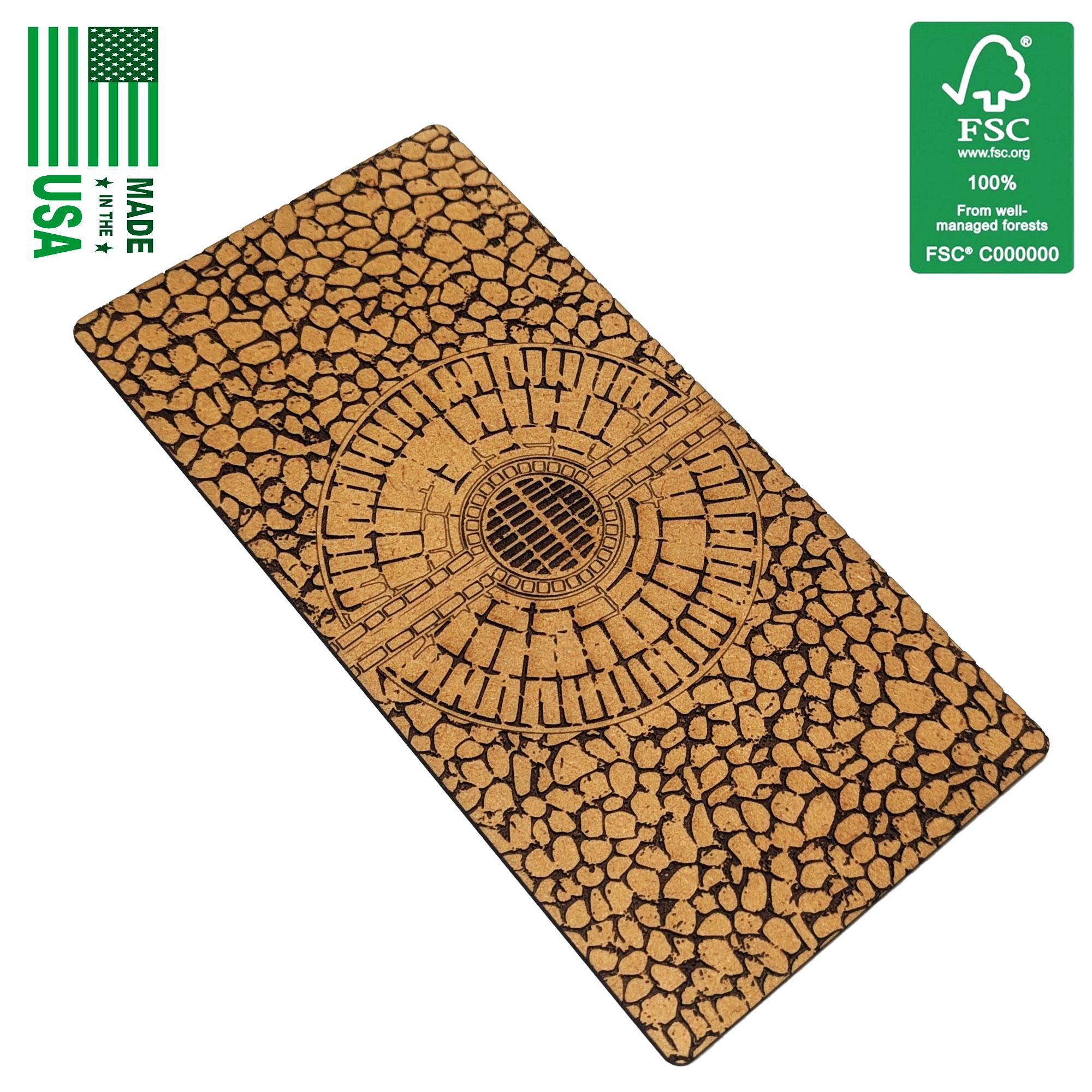 These 3mm and 6mm MDF bases are 20cm long by 10cm wide, matching the dimensions of Warhammer 40k ‘Small L’ terrain base, but are ideal for generic gaming terrain, Dungeons and Dragons, crafting and more. This base features a stone tile pattern, with a small drainage ditch/culvert running through the center, leading into a central covered drain surrounded by a central sigil to catch any water, ooze, slime or blood that may seep from the battlefield. We take extra time to cut our bases deeper, making them quicker and easier to paint, drybrush and finish.