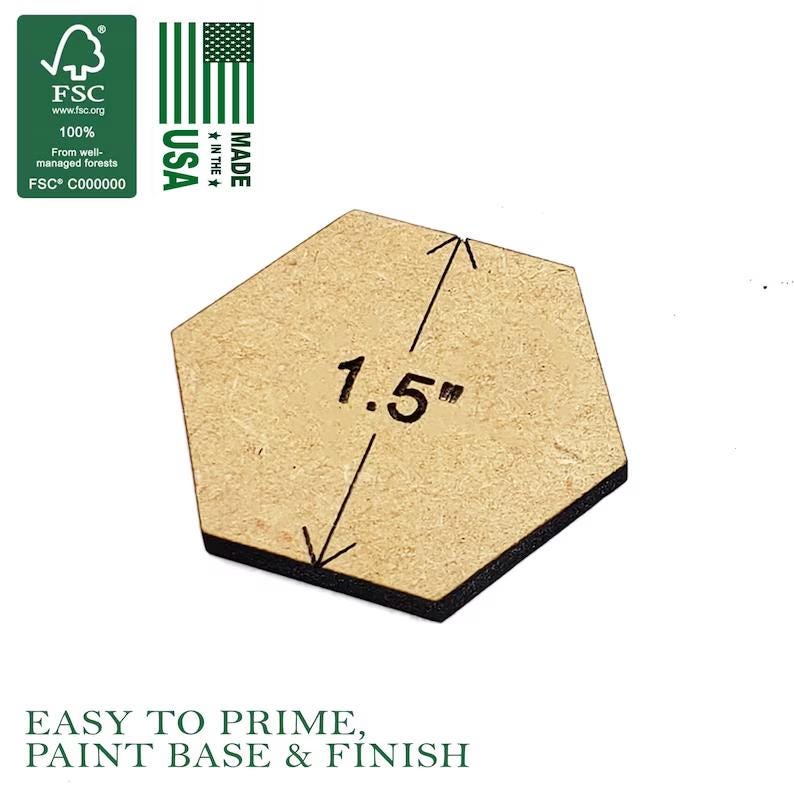 These 3mm and 6mm MDF bases are 1.5" from FLAT TO FLAT (38.1mm), and are designed for 6mm, small scale battles, dungeons and TTRPGs such as Battletech, EPIC 40k or similar 40mm scale game maps - but are ideal for any miniature war or board gaming.